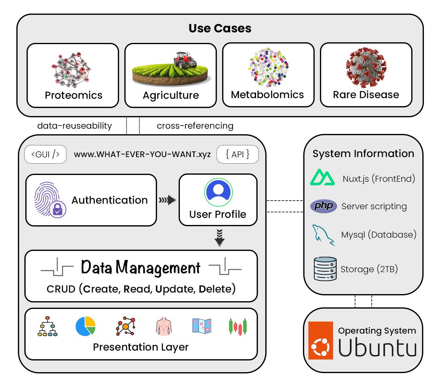 Fig 1. The architecture of the CMS is designed with a structured data layer accessible through three application programming interfaces (APIs). The frontend, built with Nuxt.js, utilizes predefined requests to interact with the database, enabling efficient data retrieval and visualization.